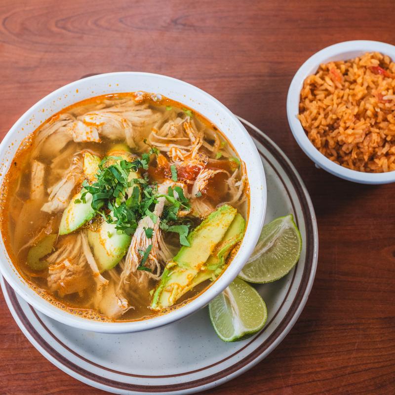 Chicken broth filled with shredded chicken, rice, pico de gallo, and a slice of avocado | Any change or substitution is subject to additional charge.