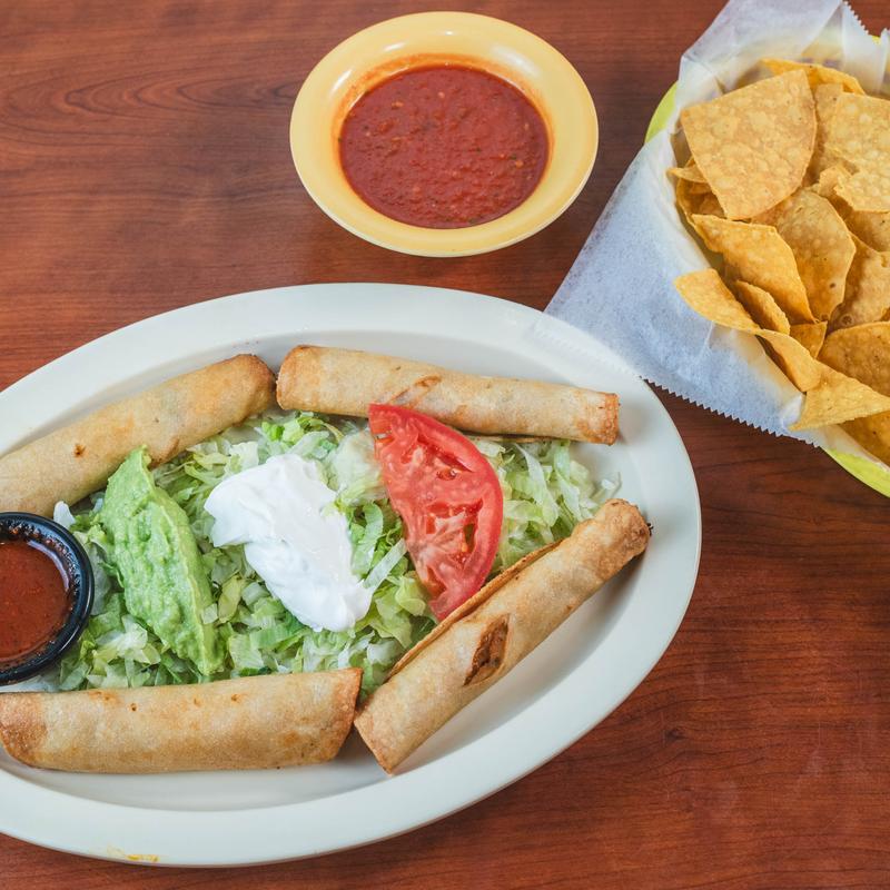Four fried corn taquitos, two beef and two chicken, served with lettuce, guacamole, tomatoes, and sour cream.