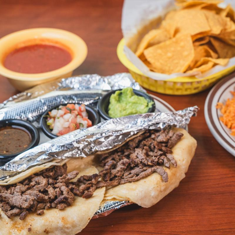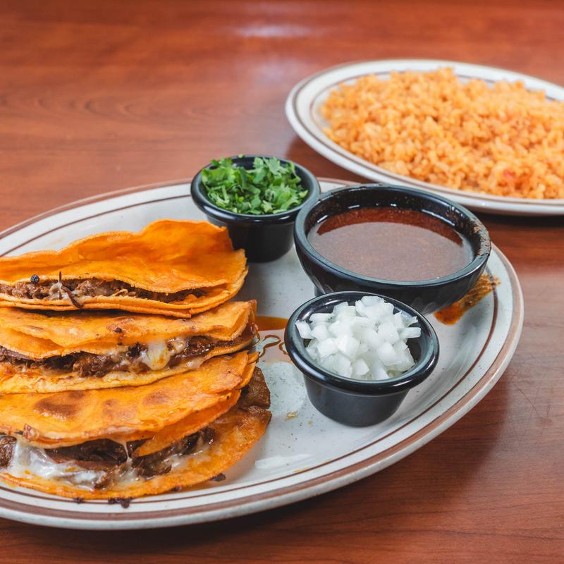 Three corn tortillas seasoned in beef consome, stuffed with shredded beef, melted shredded cheese, and topped with cilantro and onions, served with your choice of consome or rice.