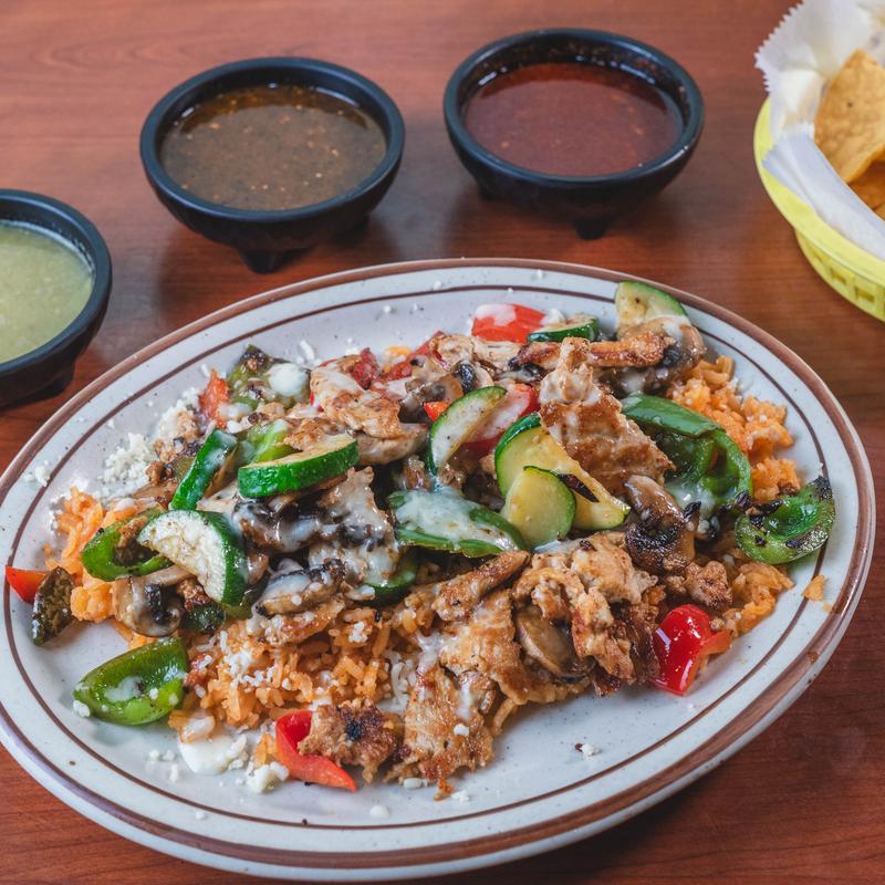 Chicken or steak smothered in our cheese sauce, topped with bell peppers, onions, and tomatoes. Served with flour tortillas, rice, and salad.
