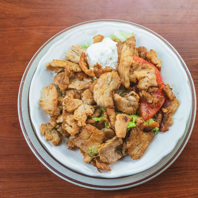 Crispy flat corn tortilla topped with your choice of shredded chicken or ground beef, topped with lettuce, tomatoes, and guacamole.