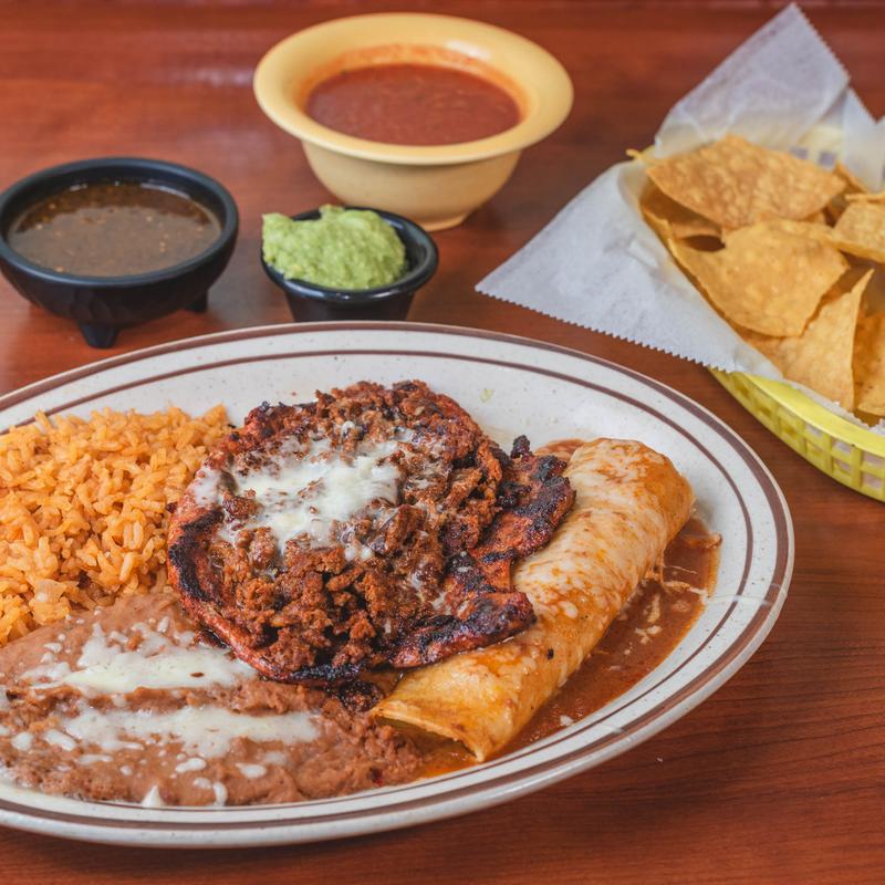Juicy marinated grilled chicken breast topped with Mexican chorizo and cheese sauce, served with rice, beans, flour tortillas, and one chicken enchilada.
