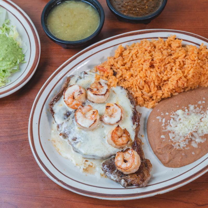 Ribeye steak and shrimp topped with cheese sauce, served with rice, beans, salad, and flour tortillas.