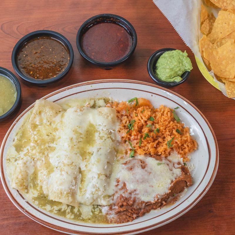 Three enchiladas, one shredded chicken, one shredded beef, and one cheese, topped with green tomatillo salsa, served with rice and beans.