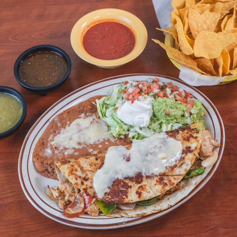 Quesadilla filled with your choice of ground beef or shredded chicken, served with lettuce, tomatoes, sour cream, and guacamole.