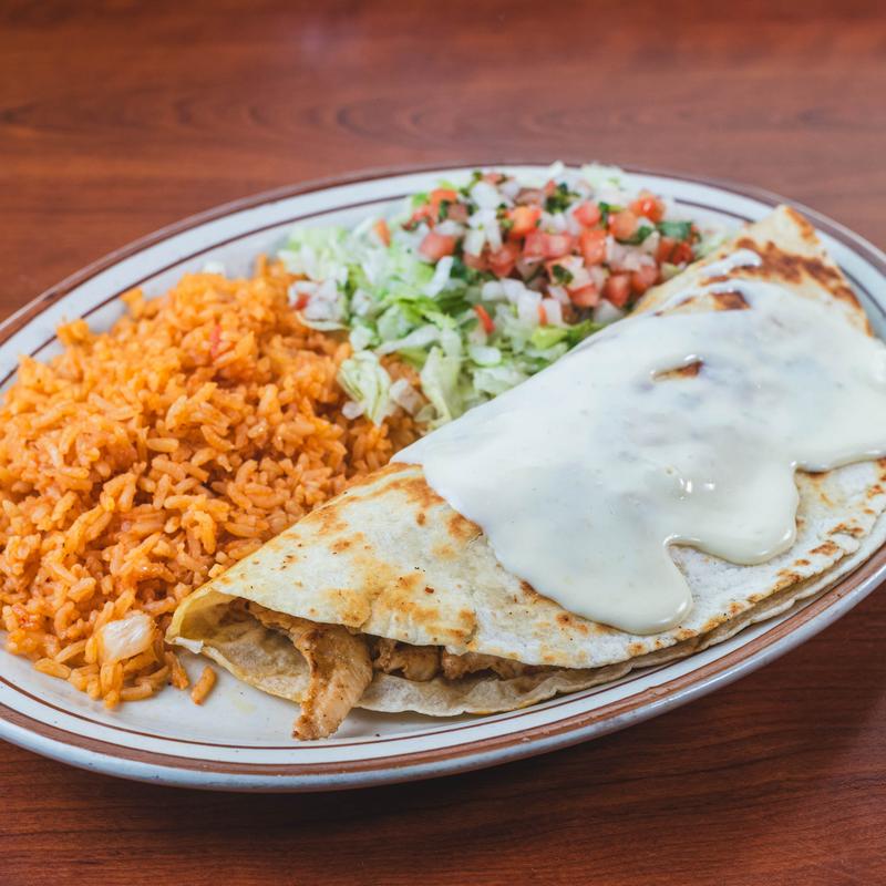 Quesadilla filled with grilled chicken and melted shredded cheese, served with salad and rice.