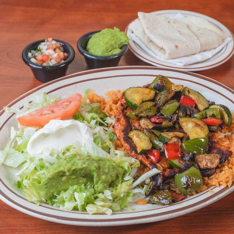Juicy marinated grilled chicken topped with red and green peppers, mushrooms, yellow squash, and zucchini, served with rice, guacamole salad, sour cream, and flour tortillas.