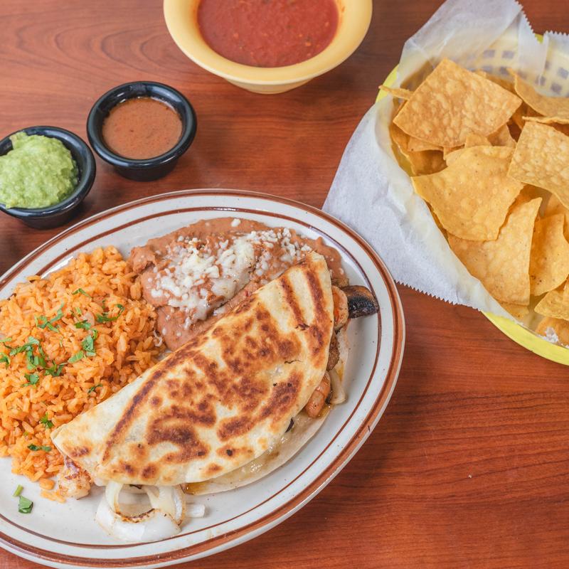Quesadilla filled with shredded cheese, grilled chicken, and chorizo, served with rice and beans.