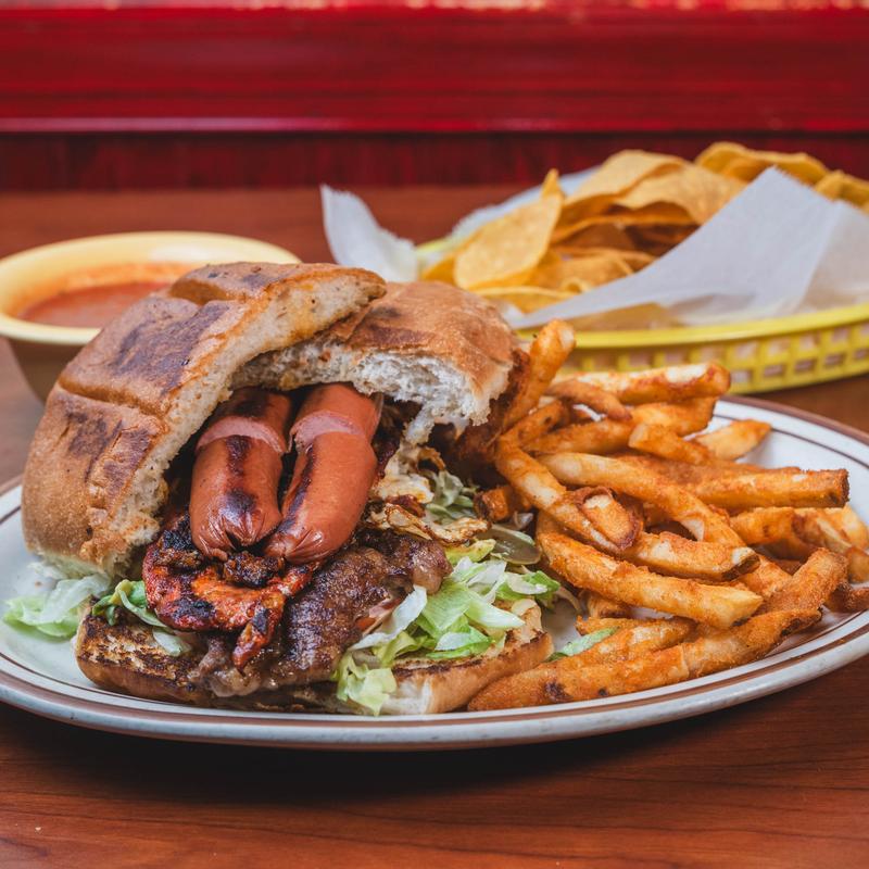 Mexican sandwich filled with your choice of carne asada, chorizo, chicken, or al pastor. Served with fries.